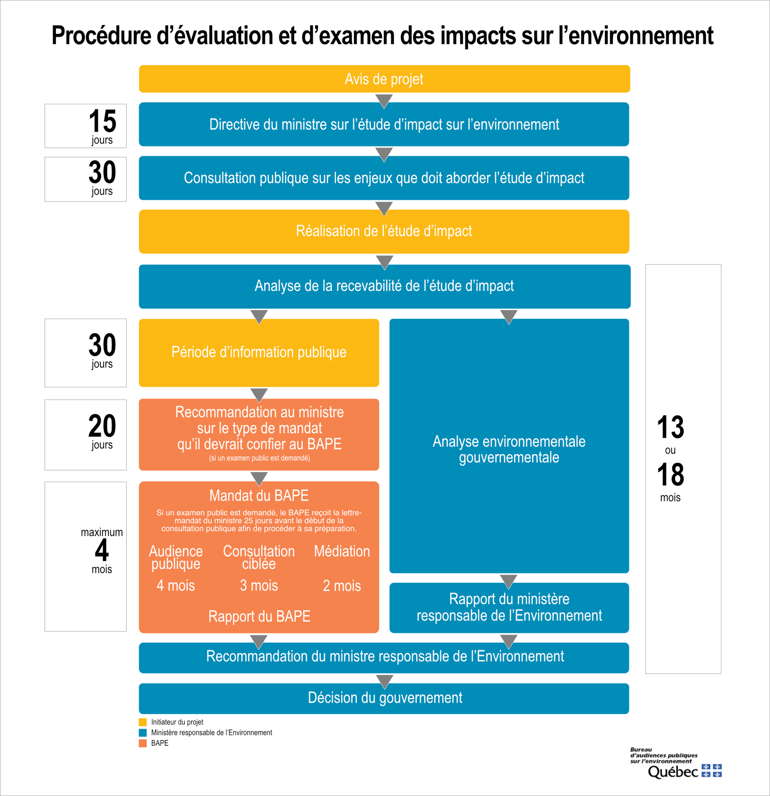 Dans un premier temps, il est important de bien distinguer la durée de la Procédure d’évaluation et d’examen des impacts sur l’environnement (PÉEIE) – à laquelle sont assujettis les projets d’envergure présentant un risque environnemental élevé – et la durée d’un examen public du BAPE qui s’inscrit à l’intérieur de la PÉEIE.